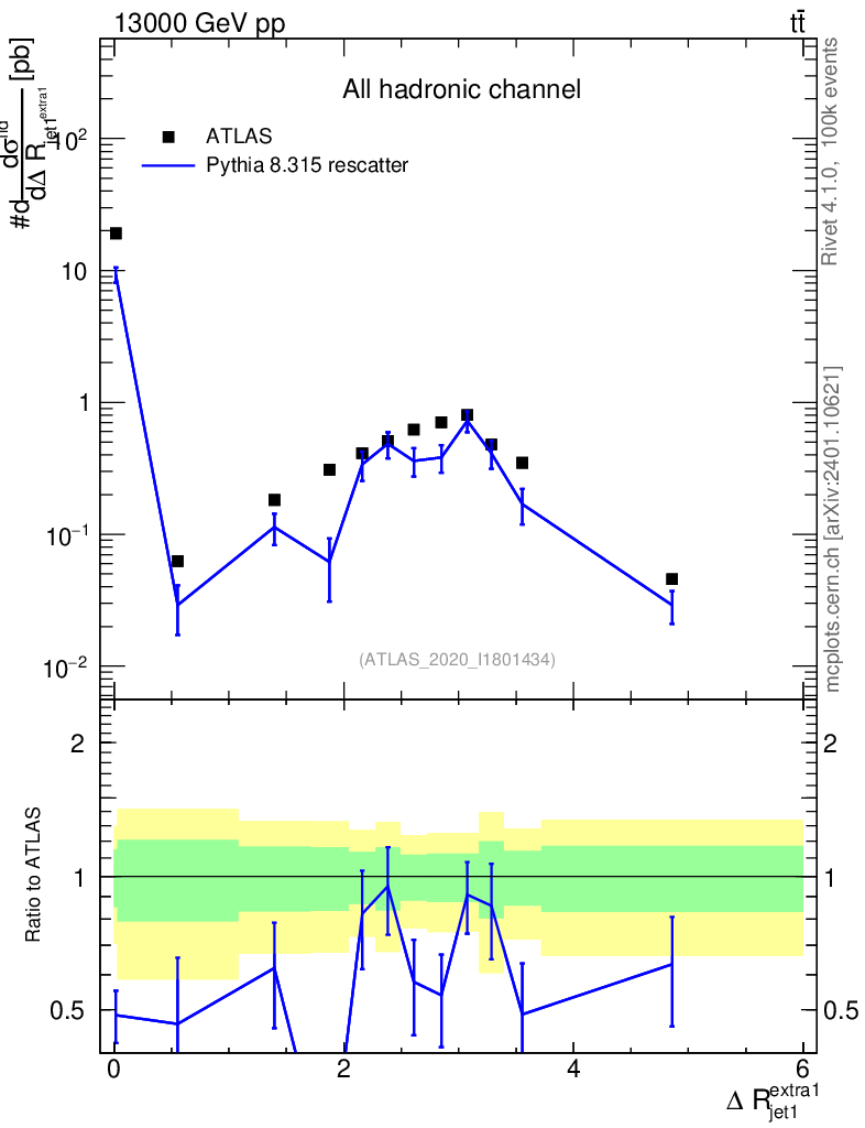 Lines: data, pythia8 8.315 rescatter |