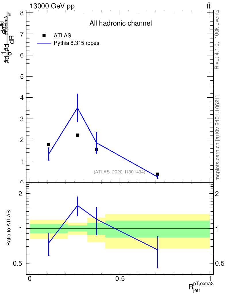Lines: data, pythia8 8.315 ropes |