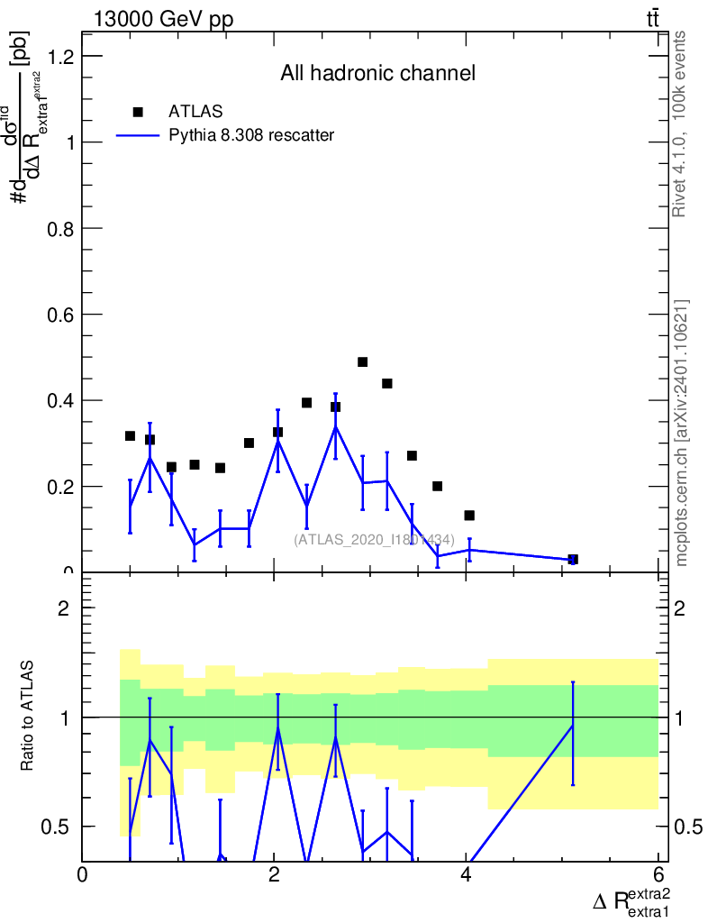 Lines: data, pythia8 8.308 rescatter |