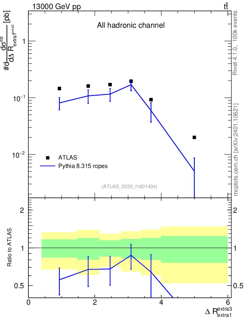 Lines: data, pythia8 8.315 ropes |