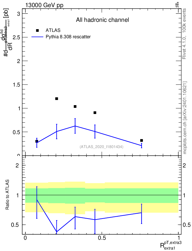 Lines: data, pythia8 8.308 rescatter |