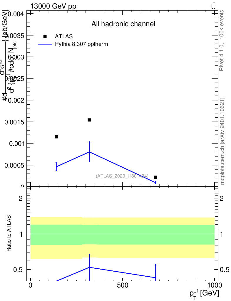 Lines: data, pythia8 8.307 pptherm |