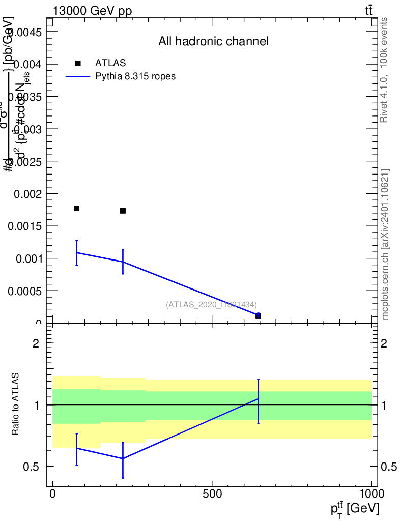 Lines: data, pythia8 8.315 ropes |