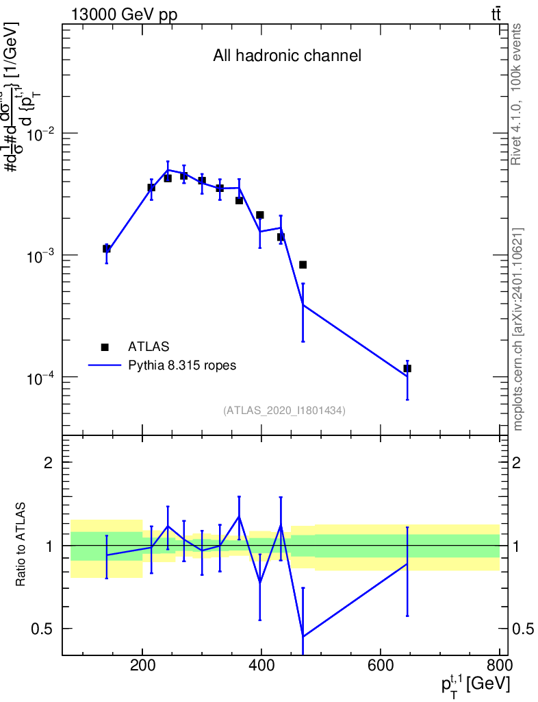 Lines: data, pythia8 8.315 ropes |