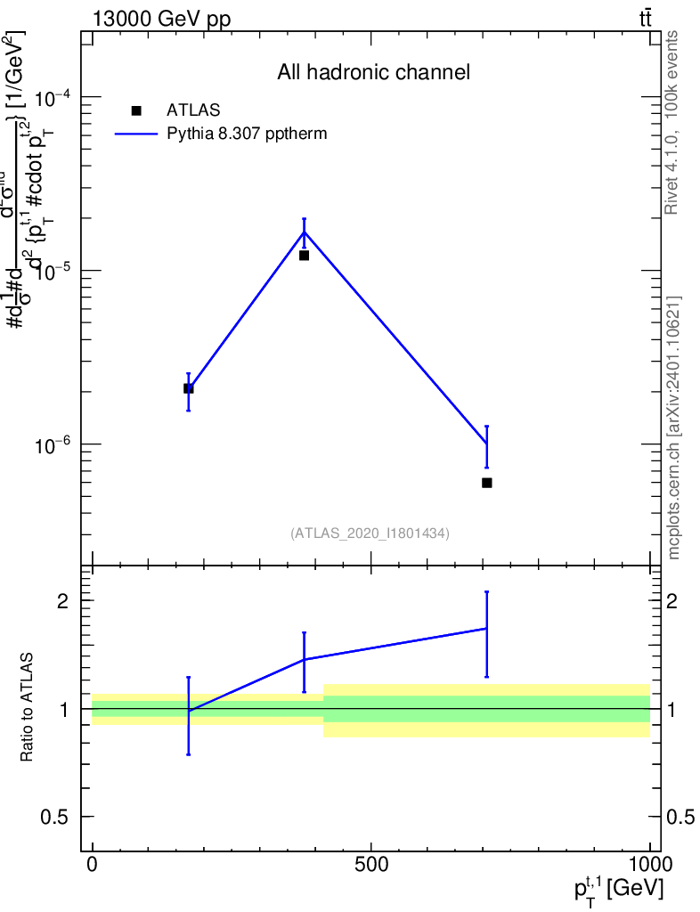 Lines: data, pythia8 8.307 pptherm |