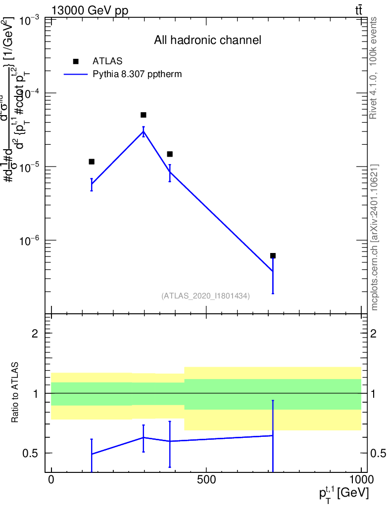 Lines: data, pythia8 8.307 pptherm |