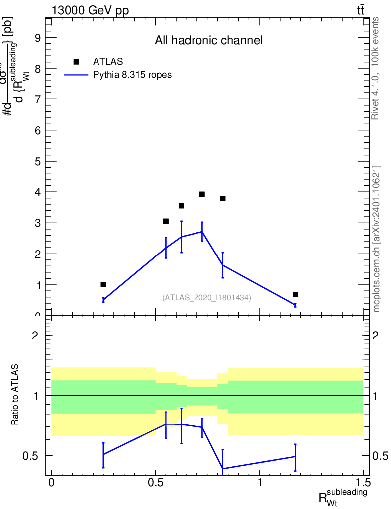 Lines: data, pythia8 8.315 ropes |