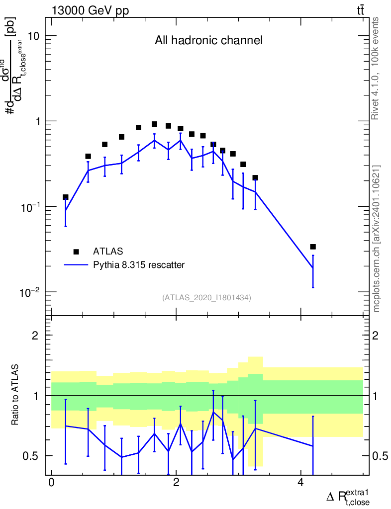 Lines: data, pythia8 8.315 rescatter | compare with other tunes