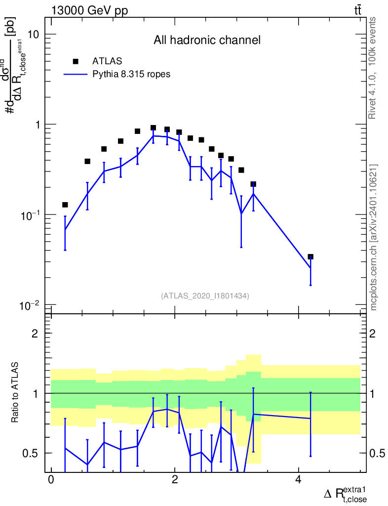Lines: data, pythia8 8.315 ropes |