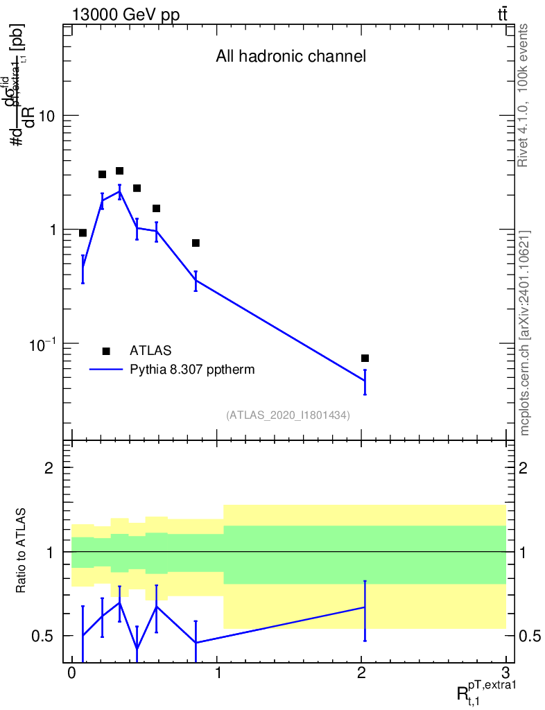 Lines: data, pythia8 8.307 pptherm |