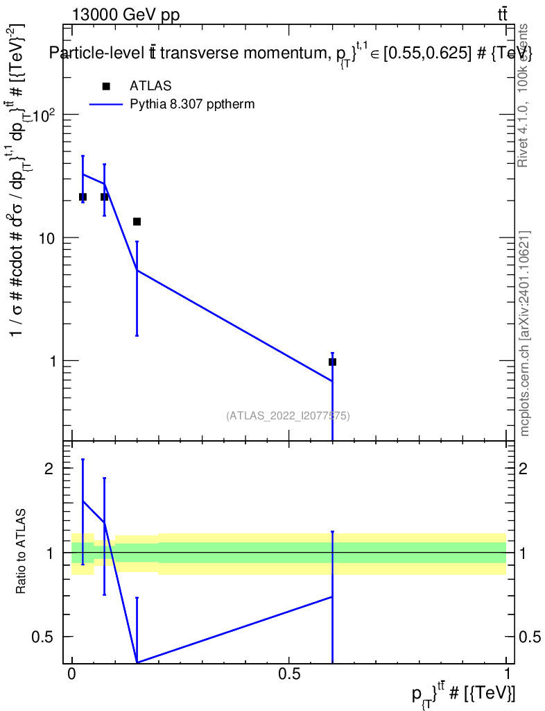 Lines: data, pythia8 8.307 pptherm |