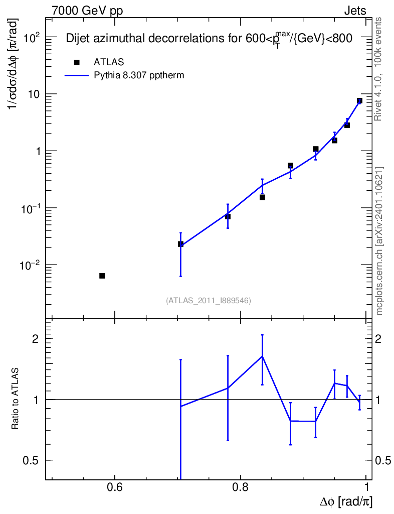 Lines: data, pythia8 8.307 pptherm |