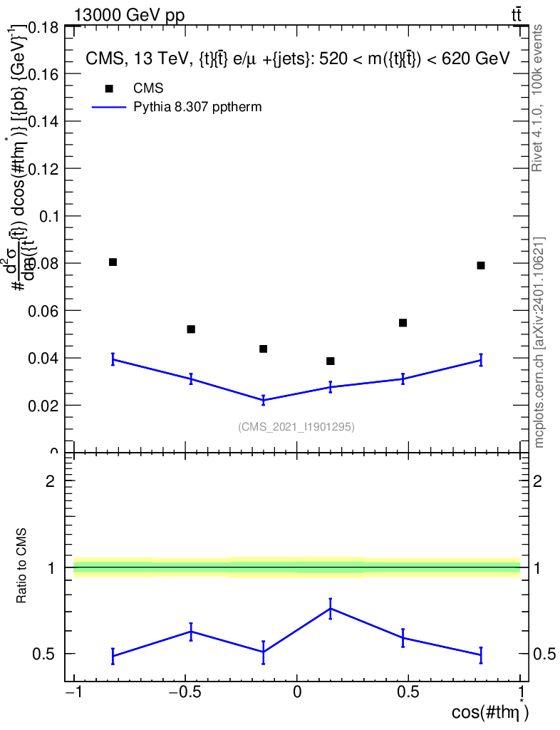 Lines: data, pythia8 8.307 pptherm |