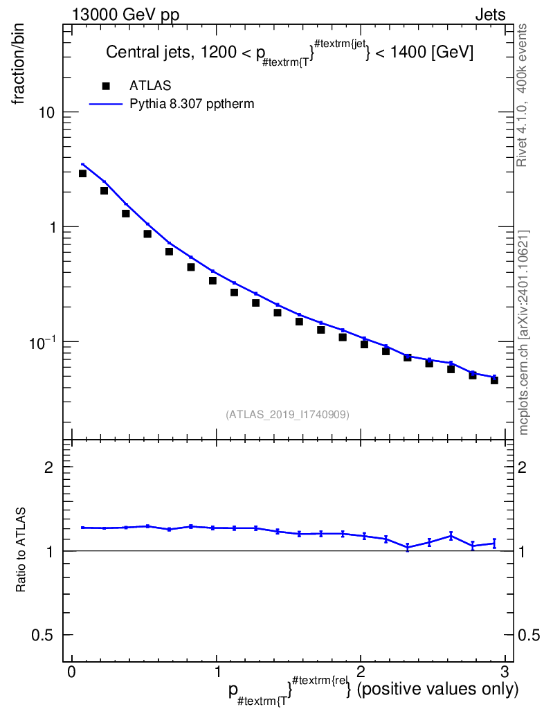 Lines: data, pythia8 8.307 pptherm |
