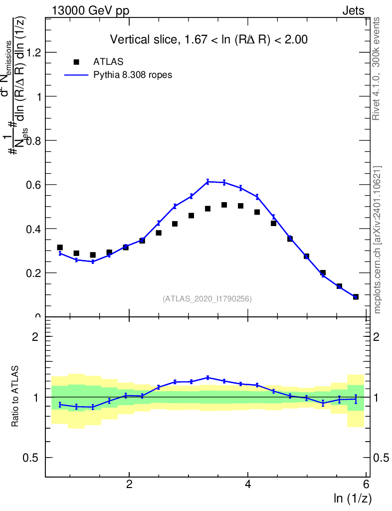 Lines: data, pythia8 8.308 ropes |