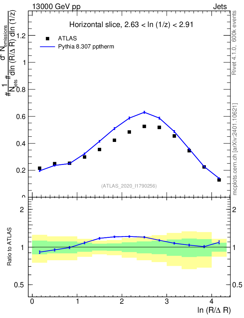 Lines: data, pythia8 8.307 pptherm |