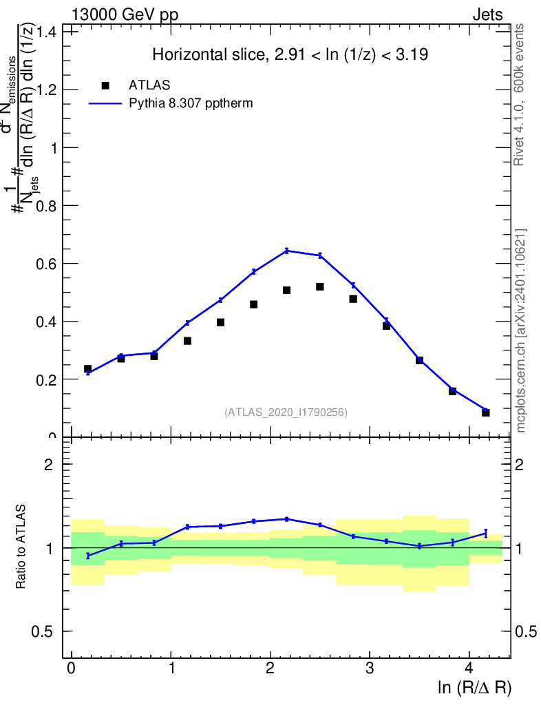 Lines: data, pythia8 8.307 pptherm |