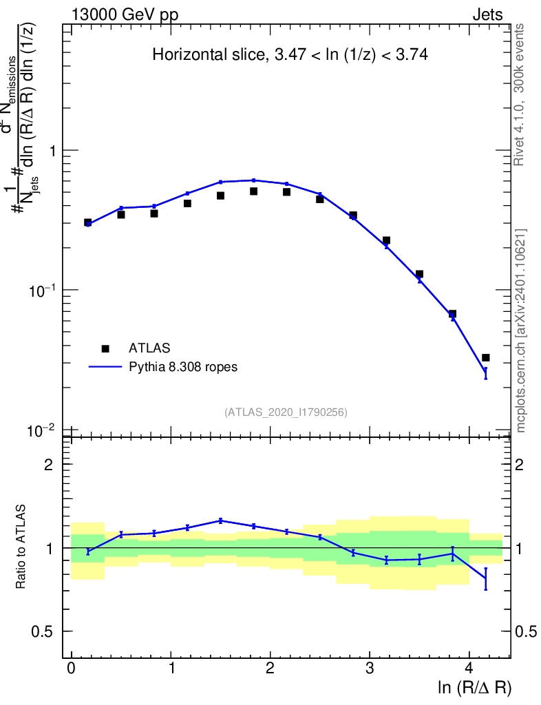 Lines: data, pythia8 8.308 ropes |