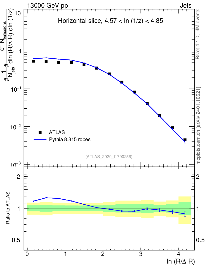 Lines: data, pythia8 8.315 ropes |