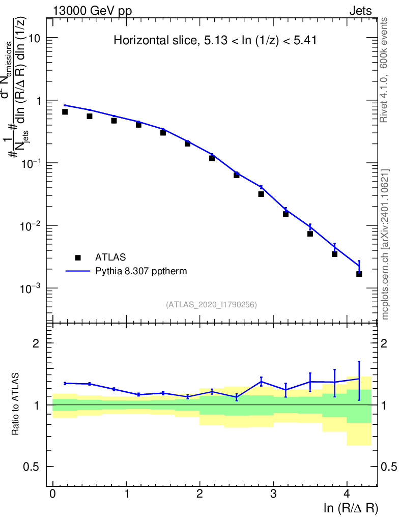 Lines: data, pythia8 8.307 pptherm |