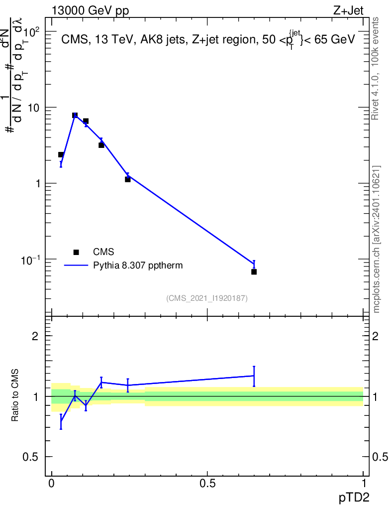 Lines: data, pythia8 8.307 pptherm |