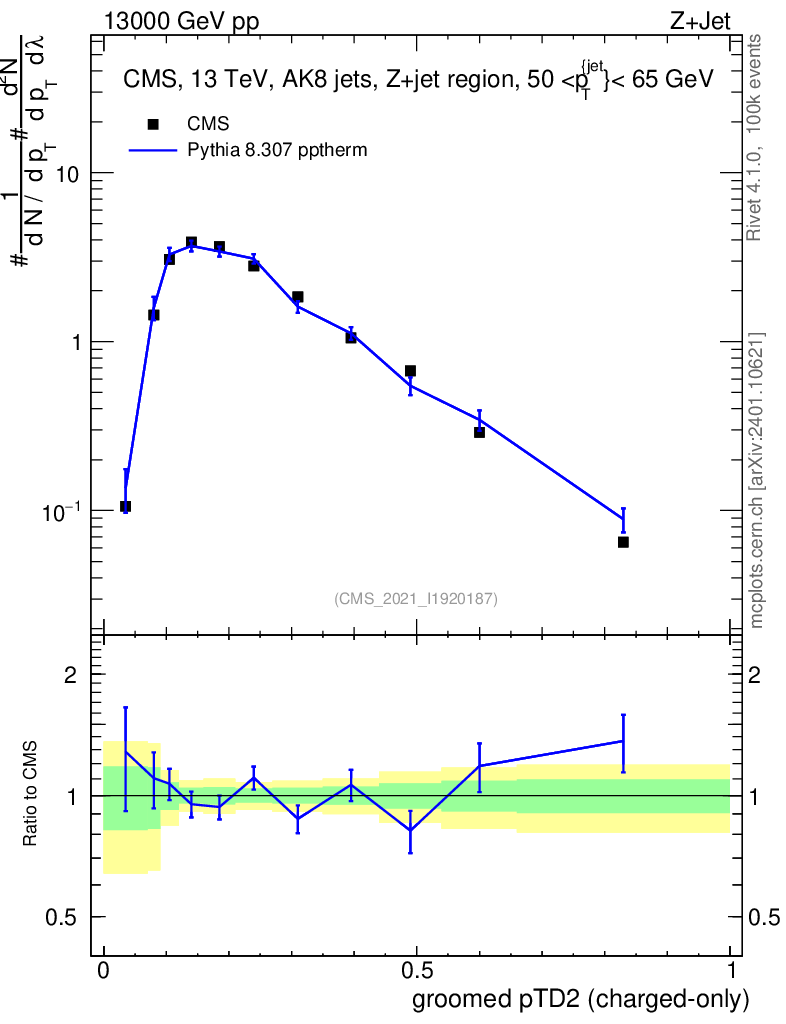 Lines: data, pythia8 8.307 pptherm |