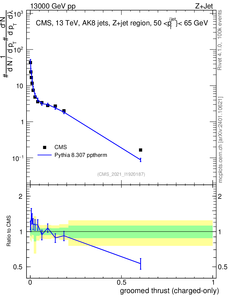 Lines: data, pythia8 8.307 pptherm |