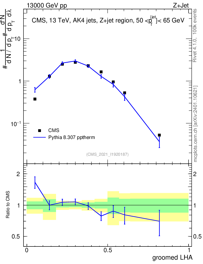 Lines: data, pythia8 8.307 pptherm |
