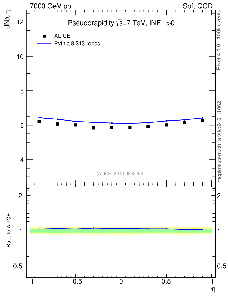 Lines: data, pythia8 8.313 ropes |