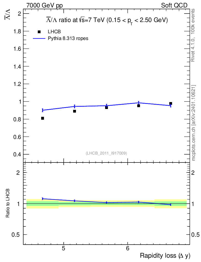 Lines: data, pythia8 8.313 ropes |