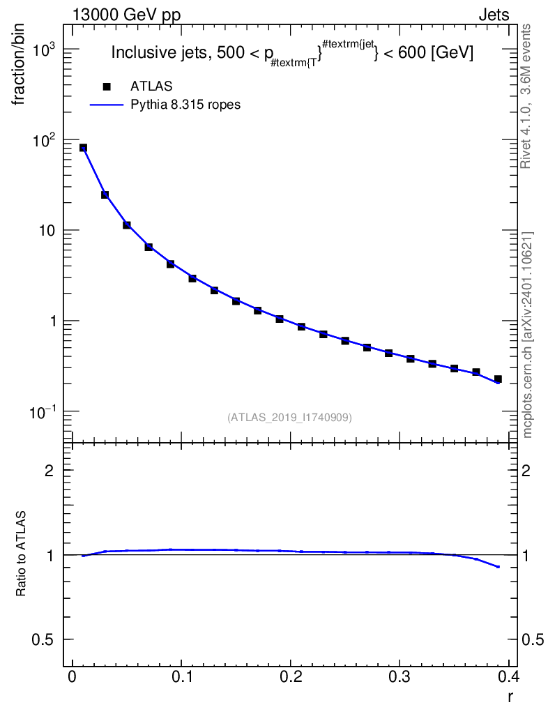Lines: data, pythia8 8.315 ropes |