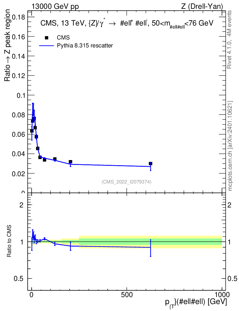 Lines: data, pythia8 8.315 rescatter |