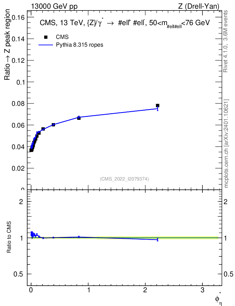 Lines: data, pythia8 8.315 ropes |