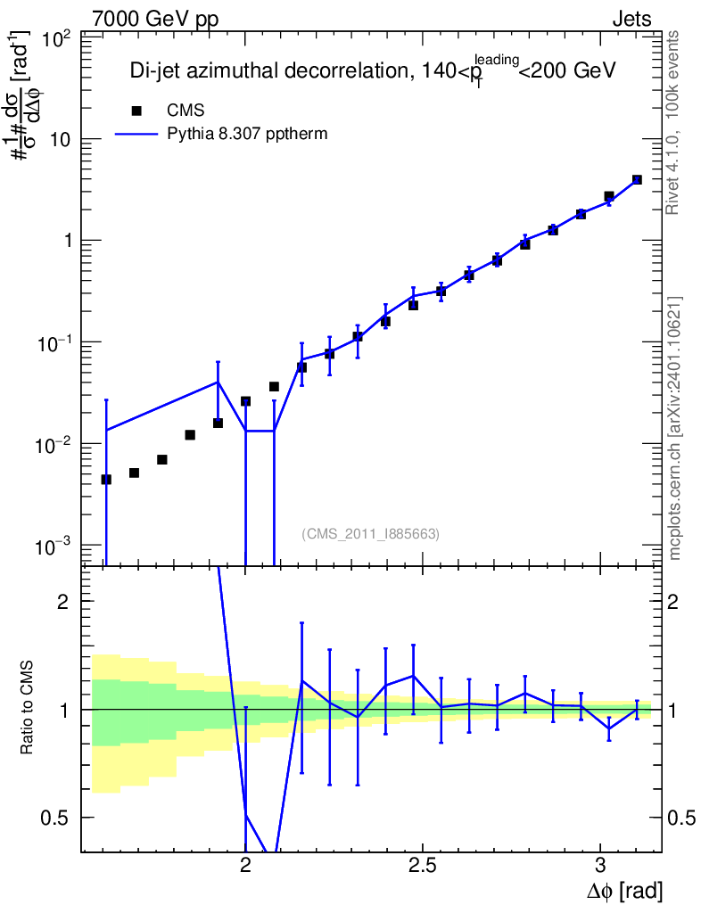 Lines: data, pythia8 8.307 pptherm |
