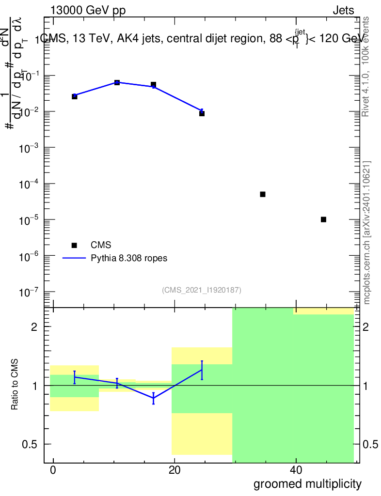 Lines: data, pythia8 8.308 ropes |