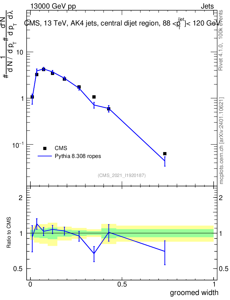 Lines: data, pythia8 8.308 ropes |