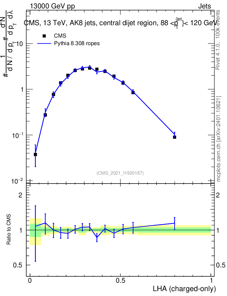 Lines: data, pythia8 8.308 ropes |