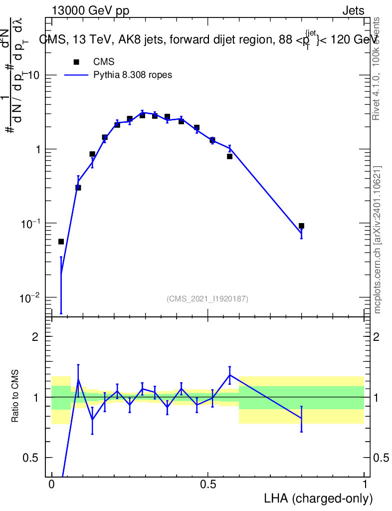 Lines: data, pythia8 8.308 ropes |