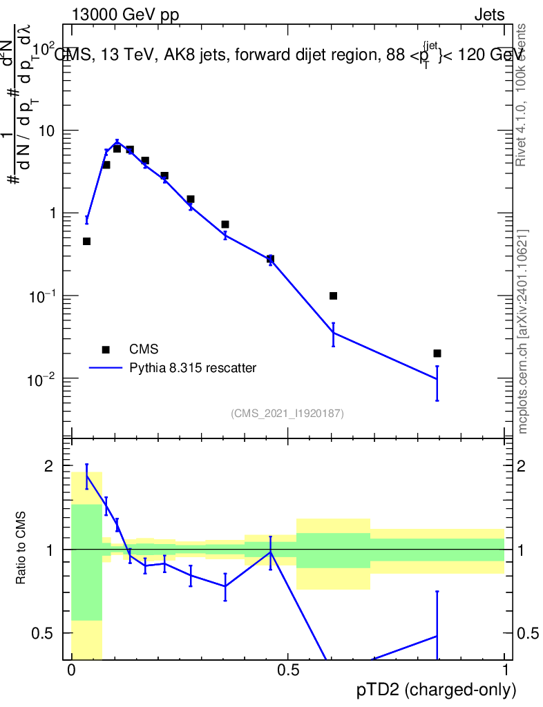 Lines: data, pythia8 8.315 rescatter |