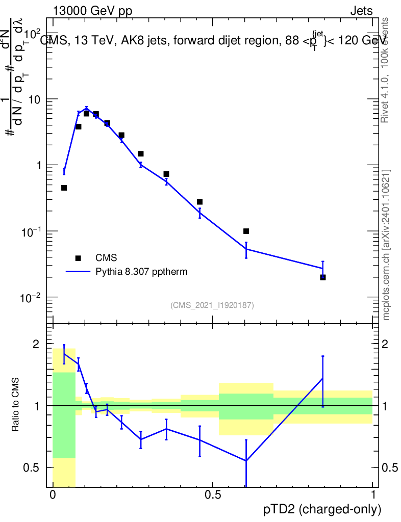 Lines: data, pythia8 8.307 pptherm |