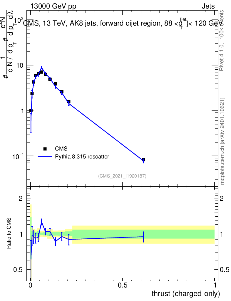 Lines: data, pythia8 8.315 rescatter |