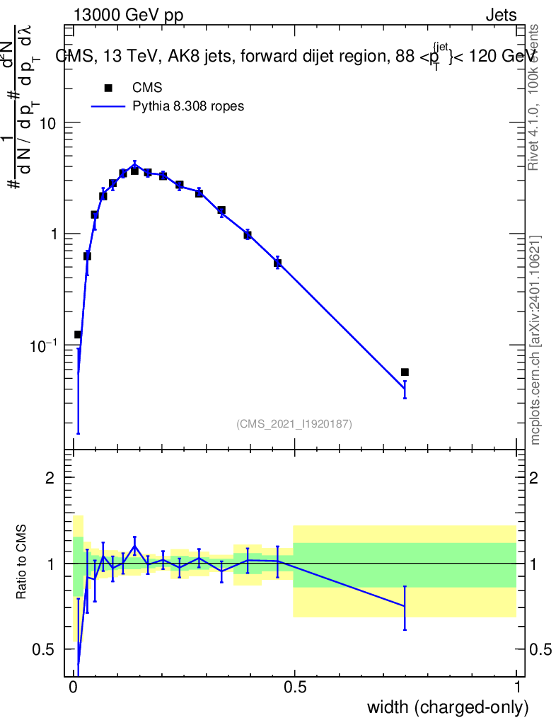 Lines: data, pythia8 8.308 ropes |