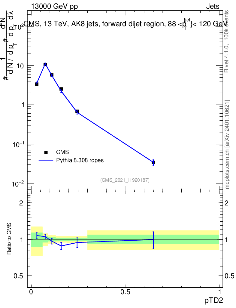 Lines: data, pythia8 8.308 ropes |