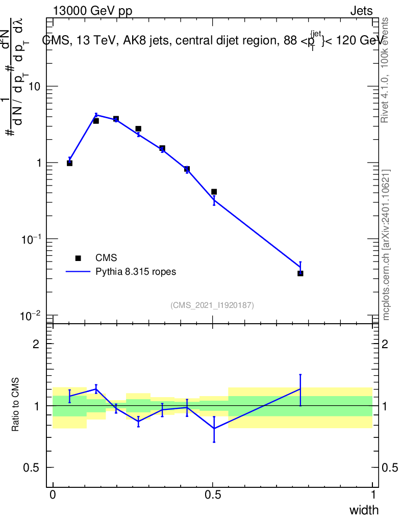 Lines: data, pythia8 8.315 ropes |
