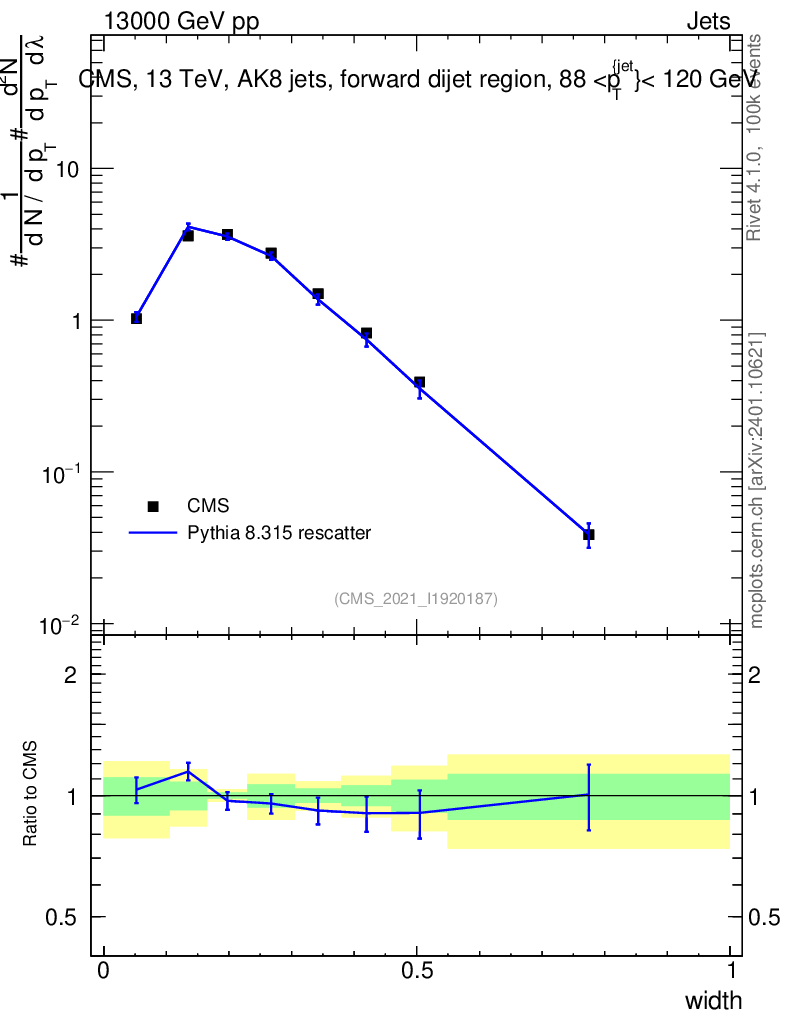 Lines: data, pythia8 8.315 rescatter |