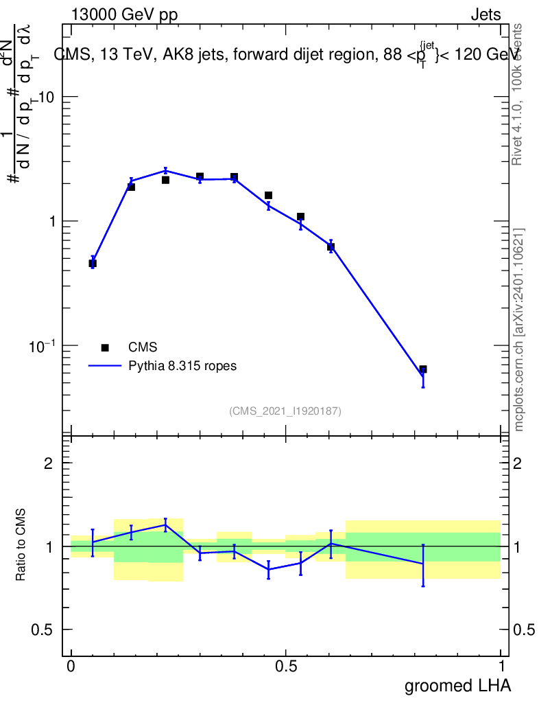 Lines: data, pythia8 8.315 ropes |