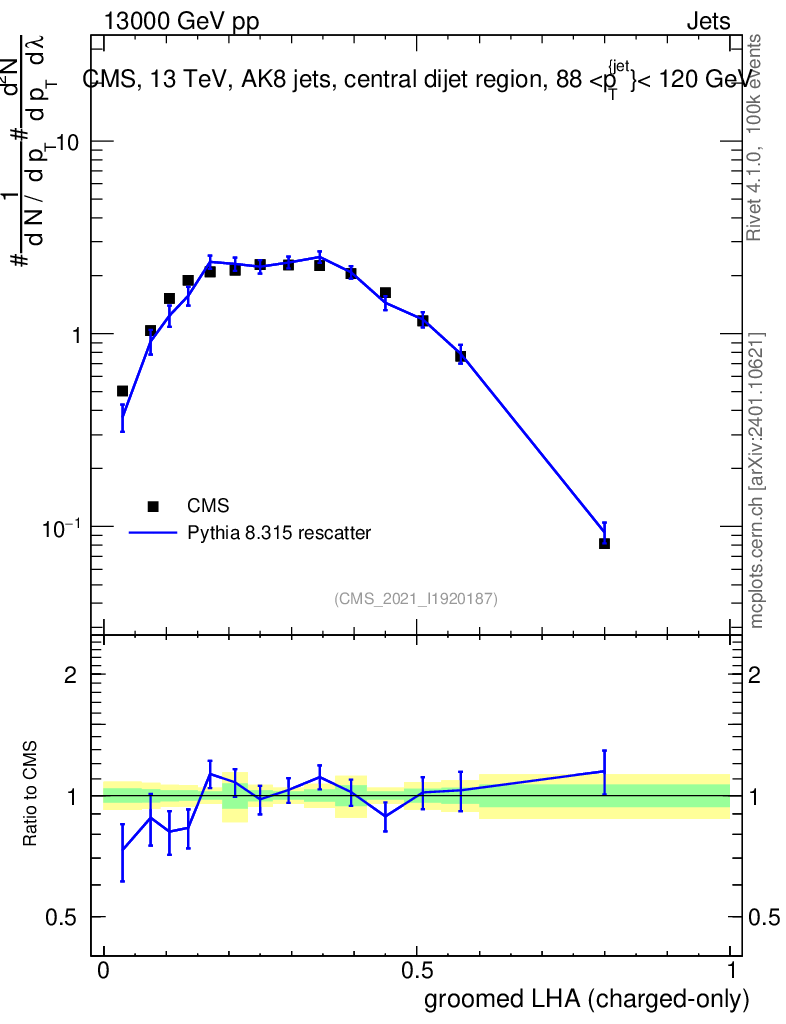 Lines: data, pythia8 8.315 rescatter |