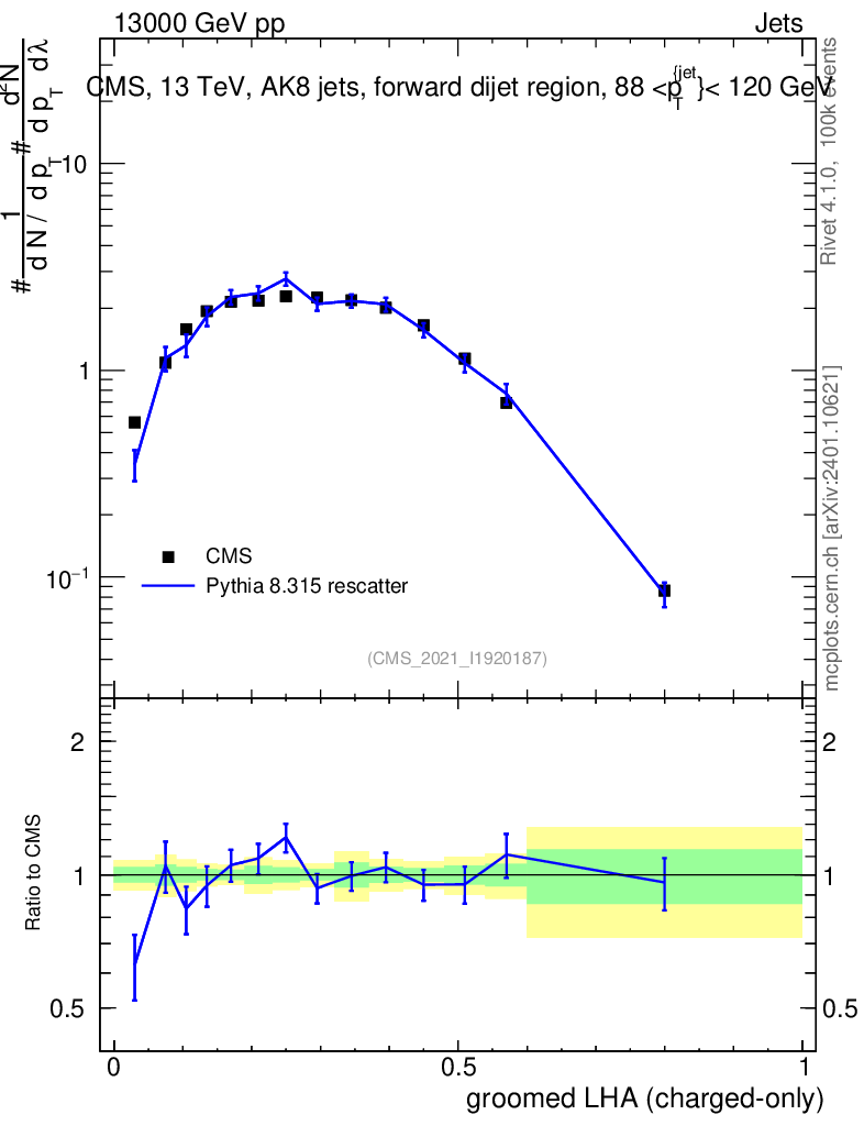 Lines: data, pythia8 8.315 rescatter |