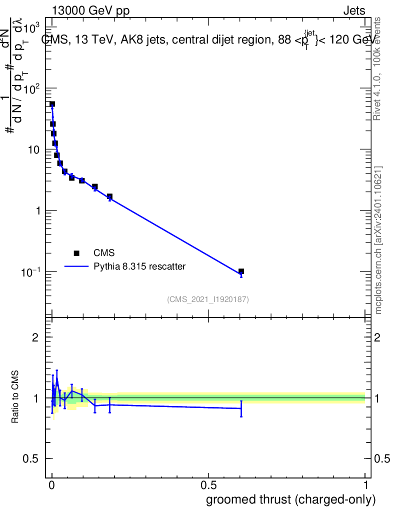 Lines: data, pythia8 8.315 rescatter |