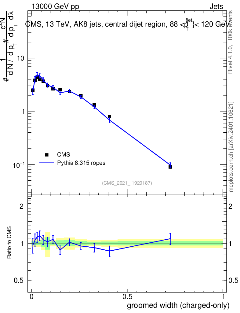 Lines: data, pythia8 8.315 ropes |